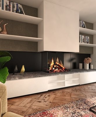 - Tweezijdig vuurzicht: Een 2-zijdige inbouwhaard, ook wel hoekhaard genoemd, is een elektrische inbouwhaard met glazen kanten aan beide zijden. Deze haarden worden vaak gebruikt om een bestaande situatie, zoals een oude schouw, te vervangen door een elektrische haard.